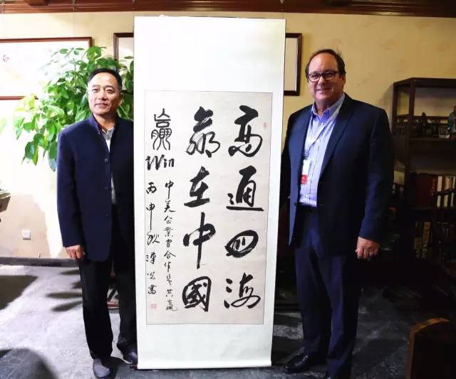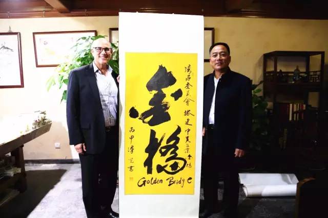 王漢光董事長還向灣區委員會代表團贈送了書法作品《金橋》和《商通四海,贏在中國》,寓意灣區委員會搭建中美企業金橋以及中美企業合作共贏。