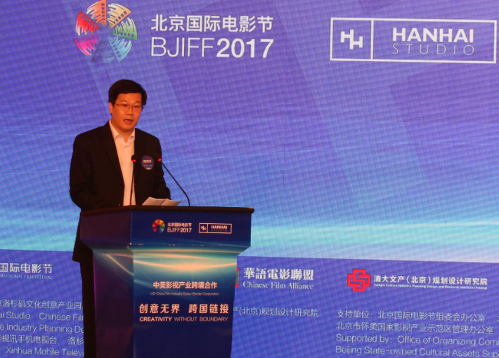 4月17日,由北京洛杉磯文化創意產業園HanhaiStudio聯合清大文產(北京)規劃設計研究院和華語電影聯盟承辦的第七屆北京國際電影節“中美影視產業跨境合作”論壇在北京國際飯店國際廳隆重舉行。北京市國有文化資產監督管理辦公室主任周茂非、北京國際電影節組委會常務副秘書長胡東等相關領導出席。本次論壇得到了北京市懷柔區人民政府、北京國際電影節組委會辦公室、北京市國有文化資產監督管理辦公室和新華社手機電視臺的大力支持。