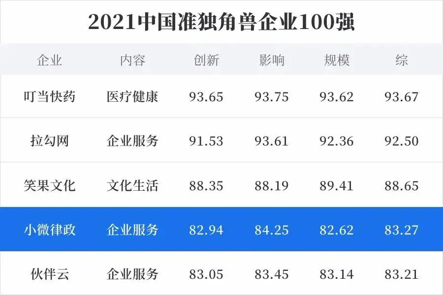 近日,中科院《互聯(lián)網(wǎng)周刊》、德本咨詢、eNet研究院聯(lián)合發(fā)布了“2021中國準(zhǔn)獨角獸企業(yè)100強(qiáng)”,榜單以企業(yè)的創(chuàng)新、影響力、規(guī)模等三大指標(biāo)進(jìn)行綜合排序,最終評選出了2021年100強(qiáng)準(zhǔn)獨角獸企業(yè),成立將滿7年的企業(yè)服務(wù)公司——小微律政,與叮當(dāng)快藥、叮咚買菜、七牛云、神策數(shù)據(jù)等知名互聯(lián)網(wǎng)公司,同時上榜。